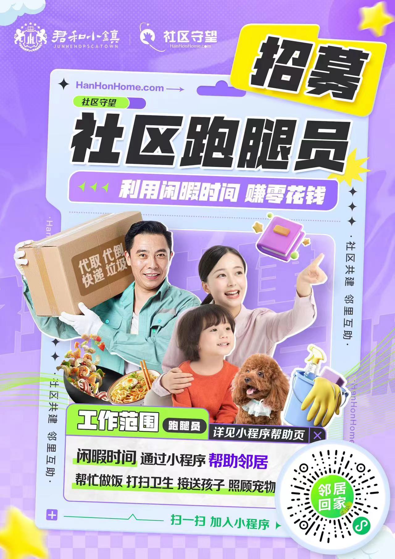 社区居民根据需求在平台下单或接单,进行日常有偿互助,如代做饭、代遛狗、宠物寄养、代买、日常整理清洁等